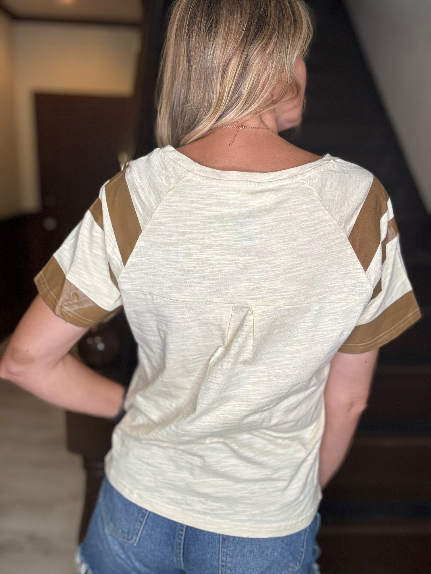 - Playful Graphic Design: Features the word "LOVE" with a football motif replacing the "O" for a sporty, fun twist. - Faux Leather Sleeve Stripes: Contrasting faux leather stripes on the sleeves evoke classic varsity vibes. - Soft Slub Knit Fabric: Crafted from lightweight, textured slub knit for a breathable and comfy fit. - Relaxed, Boxy Fit: Offers a casual silhouette with room to move, ideal for laid-back days. - Curved Hem with Side Slits: Designed with subtle side slits for added ease and a flattering drape. - Raglan Sleeves: Adds a sporty touch and enhances shoulder mobility.