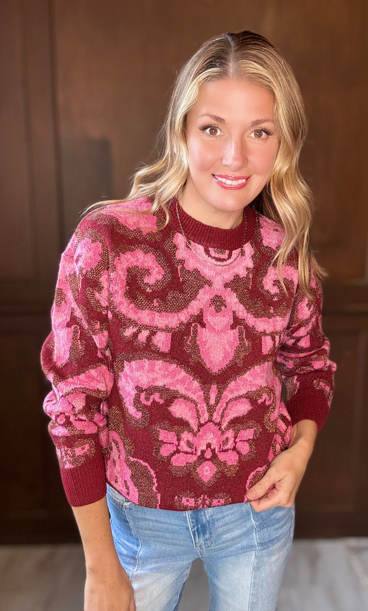 Shayla Jacquard Sweater – Burgundy & Pink Knit