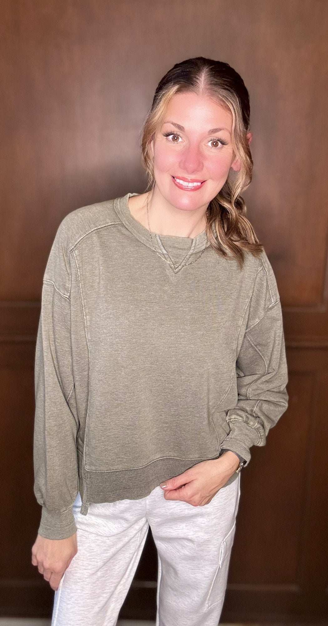 Viara Mineral Washed French Terry Crew Neck Pullover – Cozy Relaxed Fit Top